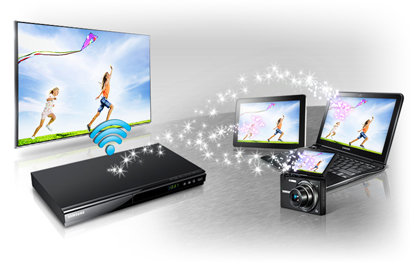 Wi-Fi Direct tworzy nowy wymiar rozrywki, umożliwiając podłączenie zestawu kina domowego do kompatybilnych urządzeń, takich jak Galaxy S2 i Samsung Smart TV bez żadnych kabli. Dzięki wbudowanej sieci bezprzewodowej możesz szybko i łatwo udostępniać zasoby na ekranie telewizora.