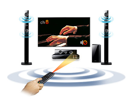 Nie pozwól, aby słaba jakość dźwięku zepsuła Twój wieczór filmowy. Dzięki funkcji TV Sound On w kinie domowym Samsung możesz słuchać wysokiej jakości dźwięku przestrzennego bezpośrednio z telewizora. Wystarczy tylko nacisnąć klawisz „TV Sound On” na pilocie, aby uzyskać najwyższej jakości dźwięk przestrzenny. Twój wieczór filmowy właśnie zyskał nową jakość.