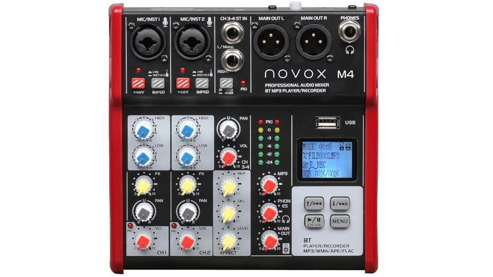 Mikser audio NOVOX M4MKII odznacza się niezwykle intuicyjną obsługą. Nikt nie powinien mieć większych problemów z uruchomieniem i manipulacją ustawieniami miksera. Jest on wyposażony w 4 kanały - monofoniczne i stereofoniczne. Istnieje możliwość podłączenia do miksera nośnika pamięci flash i nagrania na niego zarejestrowanego dźwięku. Do zalet można dołożyć również wskaźnik poziomu sygnału widoczny na obudowie urządzenia.