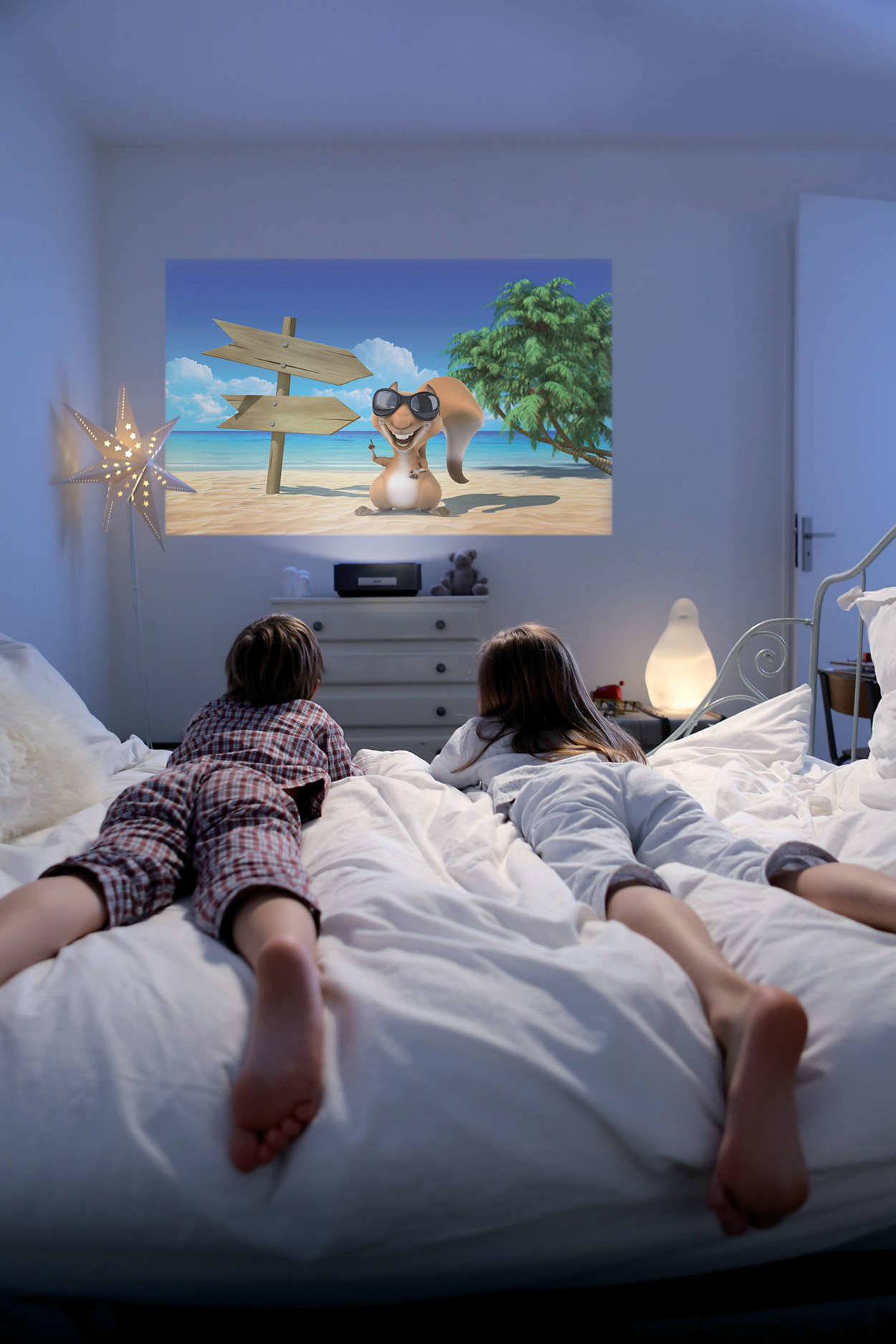 | Zachwyć się dużym obrazem Regulowany rozmiar ekranu — od 50 do 100 cali Ekran o wielkości od 50 do 100 cali zagwarantuje Ci nieznane dotąd emocje podczas oglądania filmów i imprez sportowych, a także grania w gry. Usiądź wygodnie i ciesz się chwilą w swoim ulubionym pokoju. Projektor Screeneo można z łatwością ustawić w pobliżu dowolnej gładkiej ściany — wystarczy tylko użyć stylowego skórzanego uchwytu z tyłu produktu. W przypadku kreskówek dla dzieci najlepiej sprawdza się ekran 50-calowy — aby uzyskać taki rozmiar, ustaw projektor 10 cm od ściany. Z kolei aby obejrzeć ciekawy mecz piłkarski na ekranie 100-calowym, ustaw projektor Screeneo 44 cm od ściany. |