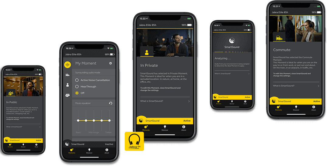 Perfekcyjne uzupełnienie słuchawek Jabra. Dostęp do SmartSound i innych funkcji, które umożliwia spersonalizowanie obsługi urządzenia Jabra. Możesz wybrać asystenta głośnomówiącego, dostosować profil muzyki i zmodyfikować, w jakim stopniu chcesz zablokować otaczające dźwięki. Możesz zapewnić optymalną pracę słuchawek dzięki prostemu wizualnemu wskaźnikowi w aplikacji, aby śledzić zużycie baterii oraz instalować aktualizacje oprogramowania i urządzenia bezpośrednio w aplikacji. Nie musisz podłączać słuchawek do komputera.