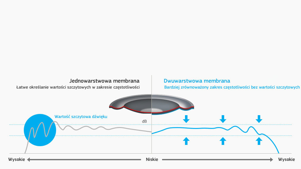| Bogactwo dźwięków Podwójna membrana tłumi wibracje, redukuje hałas i zapewnia bogaty, zrównoważony dźwięk na całym paśmie częstotliwości. |
