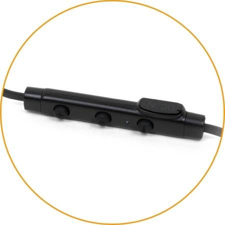 Smukły pilot multifunkcyjny umieszczony na łączącym słuchawki kablu, pozwala jednym kliknięciem uruchomić i wyłączyć słuchawki, zmienić głośność, przełączyć utwór, czy wykonać połączenie. To właśnie w nim znajdują się też złącze ładowania USB i dioda sygnalizacyjna. |