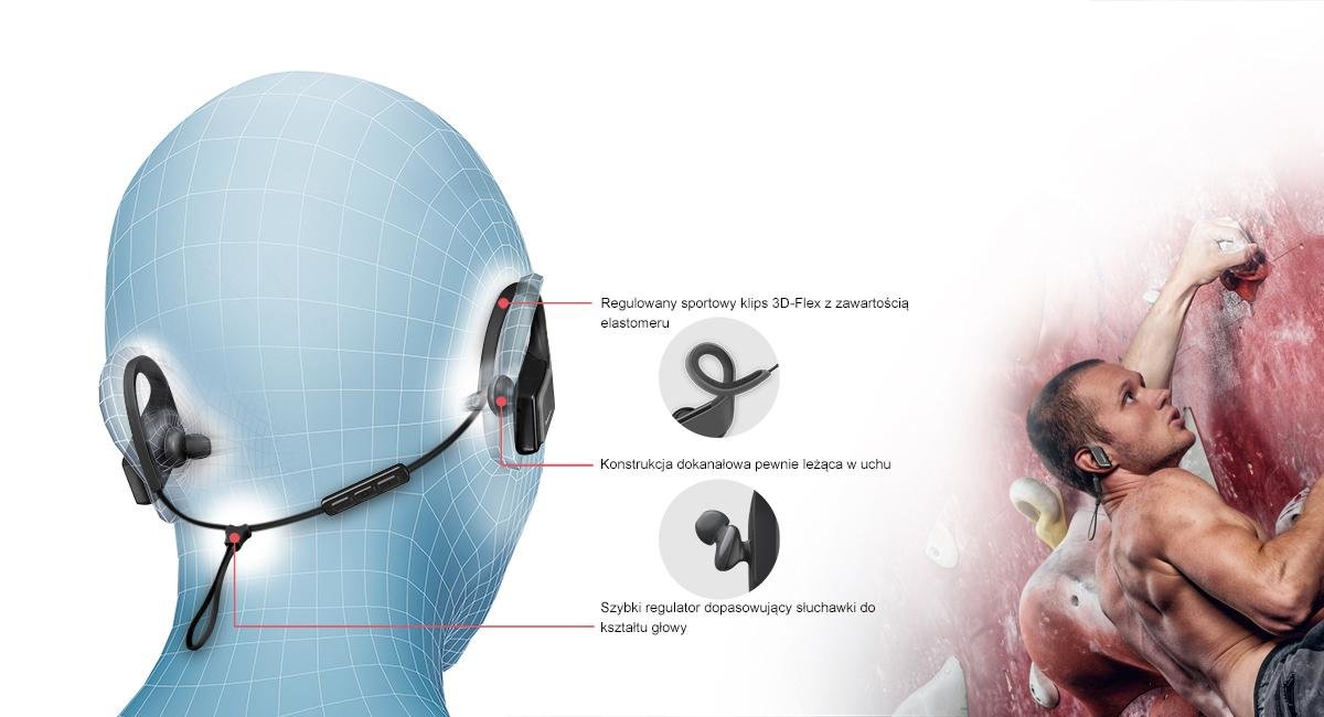 Dzięki swobodnie wyginanym zaczepom zauszniki można wygodnie dopasować do kształtu uszu. Po dopasowaniu do uszu klipsy 3D-Flex zapamiętują dany kształt i przylegają pewnie nawet podczas treningów. Konstrukcja słuchawek BTS55 doskonale pasuje do ucha, dzięki czemu możesz uprawiać sport przy ulubionej muzyce, bez względu na to, jak intensywnie się ruszasz. |