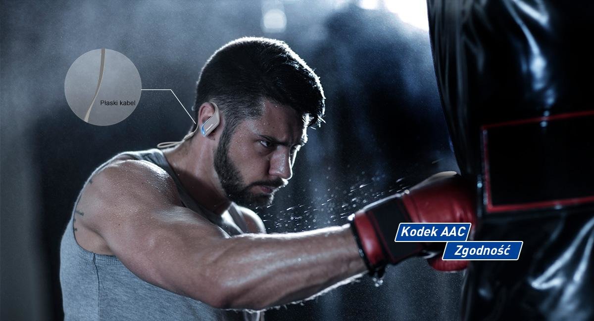 Słuchawki BTS55 są wyposażone w 9-milimetrowe przetworniki zapewniające potężne brzmienie basów i przyjemność słuchania wyrazistych dźwięków. Są zgodne z kodekiem AAC, dzięki czemu możesz słuchać muzyki bezprzewodowo, a jakość dźwięku jest wyższa niż w przypadku standardowego kodeka Bluetooth. Płaski kabel poprowadzony za uchem pozwala znacząco ograniczyć szumy kontaktowe i uzyskać wyraziste, czyste dźwięki. Dźwięk ze słuchawek BTS55 wprawi Cię w dobry nastrój i doda energii podczas treningu. |