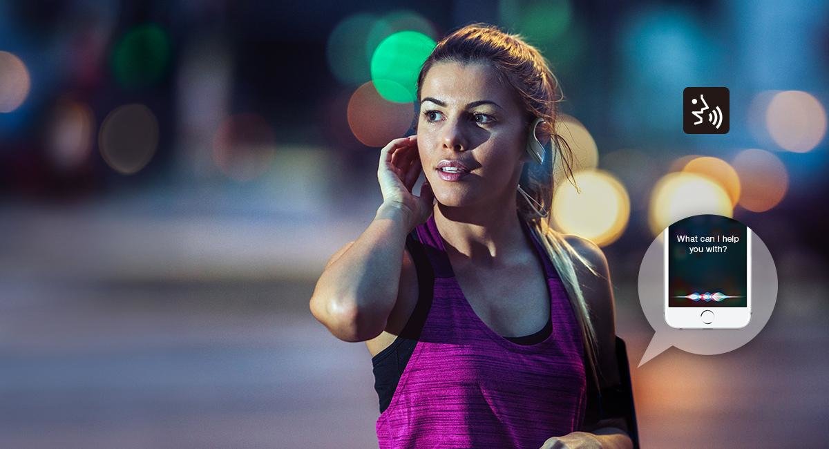 Możesz korzystać z funkcji obsługi głosowej w smartfonie, takiej jak Siri*, za pośrednictwem przycisku na pilocie. Umożliwia to wybieranie muzyki, regulowanie głośności i obsługę połączeń telefonicznych bez konieczności wyjmowania smartfona, dzięki czemu nie dekoncentrujesz się i nie tracisz motywacji podczas treningu. |