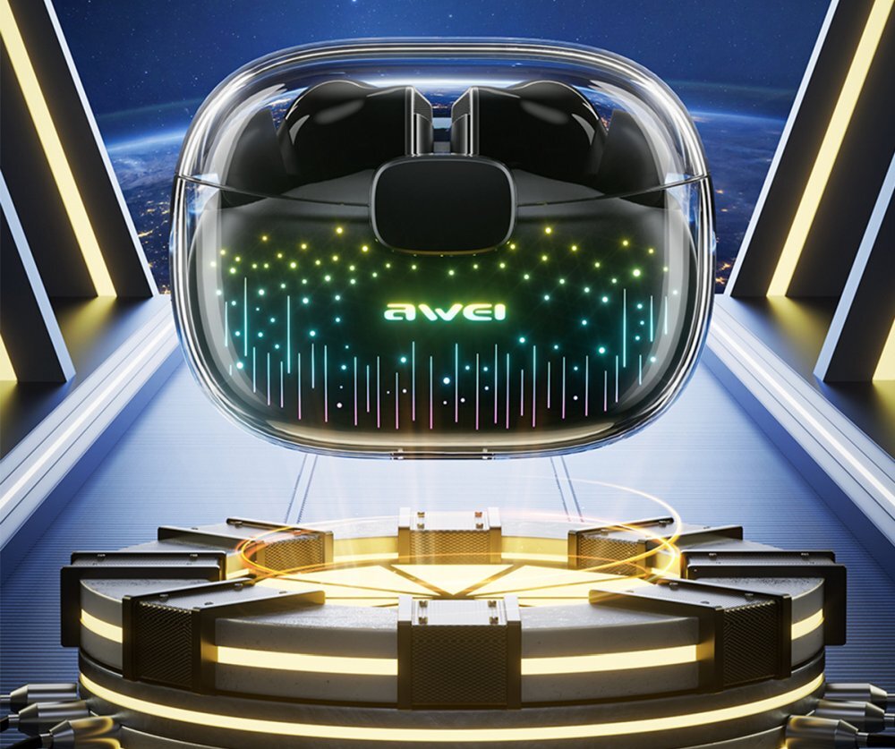 Słuchawki AWEI T52 Pro to model wyróżniający się futurystycznym projektem, dającym wciągające wrażenie wizualne. Przezroczysta kapsuła jest wyposażona w efekty świetlne „Starlight RGB”. Słuchawki AWEI T52 Pro wraz z etui to połączenie, które łączy wygodę bezprzewodowego użytkowania, doskonałą jakość dźwięku i praktyczne rozwiązania. Wykorzystując technologię Bluetooth 5.3, możesz cieszyć się bezproblemowym połączeniem z urządzeniem, a etui umożliwia wygodne ładowanie i przechowywanie słuchawek.