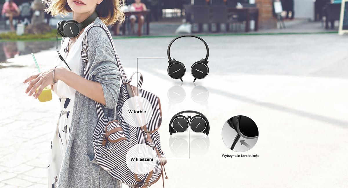 Styl, który ułatwia przenoszenie Słuchawki można złożyć na dwa sposoby, by dopasować je do rozmiarów i kształtu torby. Oznacza to, że nawet względnie duże słuchawki nauszne można złożyć do niewielkich wymiarów, by bez problemu zabrać je ze sobą, gdy wychodzisz. |