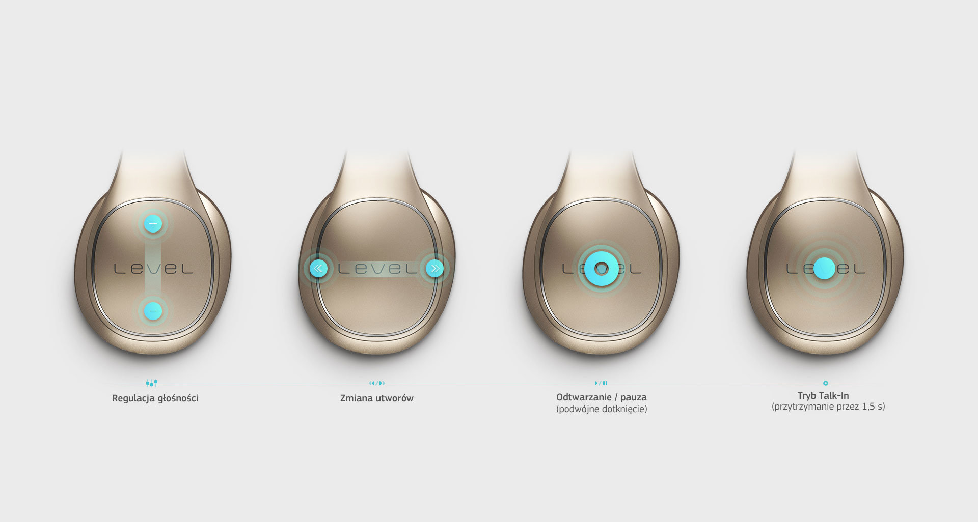 Łatwa obsługa dotykowa W pełni wykorzystaj możliwości bezprzewodowych słuchawek Level On Pro dzięki dotykowemu panelowi kontrolnemu z wieloma funkcjami. Aktywuj tryb Talk-In, dostosuj głośność, odtwarzaj, wstrzymuj i przełączaj utwory ― bez konieczności dotykania przycisków na powiązanym urządzeniu.