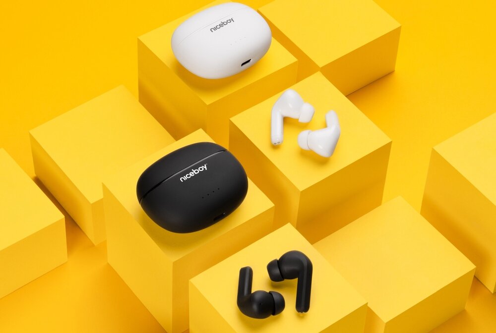 Słuchawki dokanałowe NICEBOY Hive Pins 3, etui ładujące (USB-C), kabel do ładowania (USB-A/USB-C), 3 pary zapasowych gumek dousznych i dokumentacja.