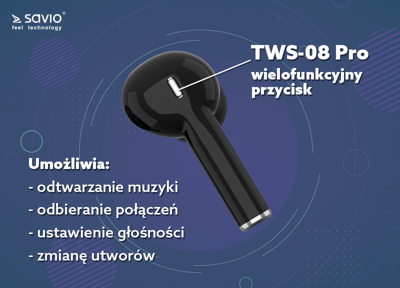 Bezprzewodowe słuchawki SAVIO TWS-08 PRO to słuchawki dokanałowe z modułem Bluetooth 5.0, pozwalającym na transmisję dźwięku bez opóźnień. Każdy zestaw wyposażony jest w trzy rozmiary miękkich i wygodnych wkładek silikonowych. Wbudowany wielofunkcyjny przycisk umożliwia łatwe sterowanie muzyką i połączeniami, a także zarządzanie głośnością oraz zmianę utworów.