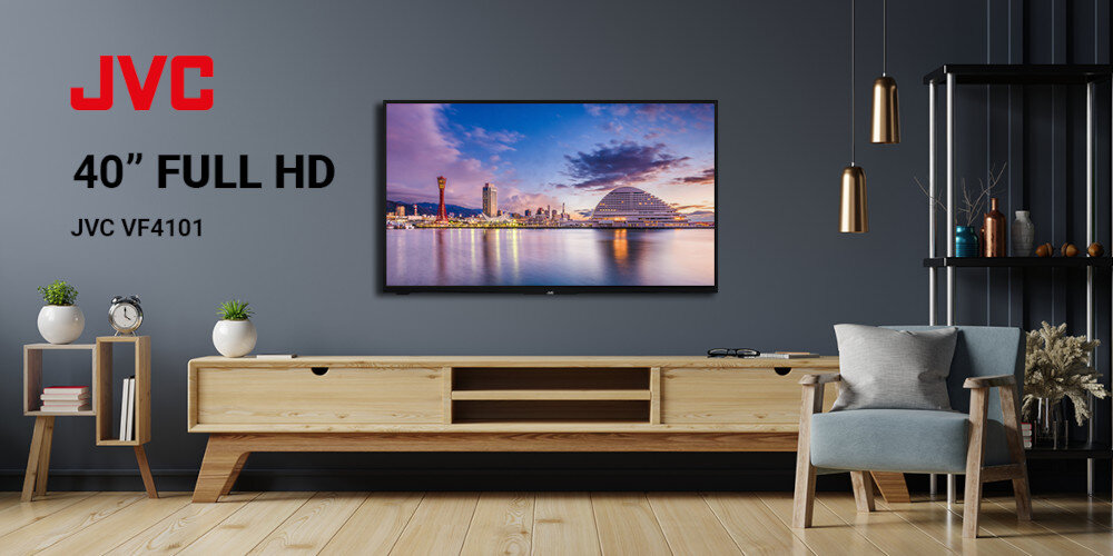 W opakowaniu znajduje się: 40-calowy telewizor JVC LT-VF4101, pilot, baterie, podstawa, dokumentacja.