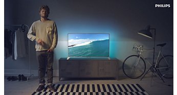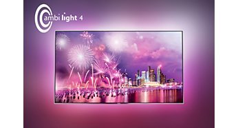 W Twoim domu panuje przytulna atmosfera, zatem wybierz telewizor, który także tworzy ciepły i miły nastrój. Nasza niezwykła technologia Ambilight emituje z czterech stron bardzo szeroką poświatę na ścianę znajdującą się za telewizorem. Dzięki temu ekran wydaje się szerszy, wrażenia z oglądania są spotęgowane, a telewizor zdaje się unosić w powietrzu. Kolory, dynamika i emocje przenoszą się poza ekran — do Twojego pokoju, zapewniając bardziej ekscytujące, intensywne i realistyczne wrażenia podczas oglądania.