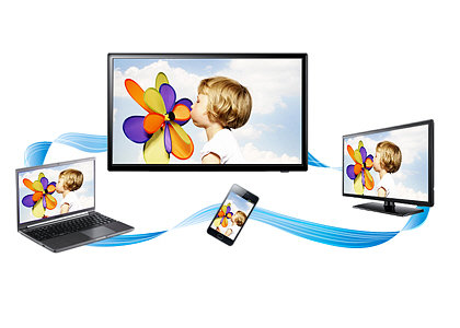 Zintegruj wszystkie urządzenia w jedną całość. Samsung Link bezprzewodowo łączy się z kompatybilnymi urządzeniami za pomocą technologii DLNA, dzięki czemu filmy, zdjęcia i muzyka zapisane na nich mogą być oglądane, odtwarzane i udostępniane na ekranie telewizora. Teraz możesz bez wysiłku przesyłać zasoby z komputera lub urządzenia mobilnego do telewizora.