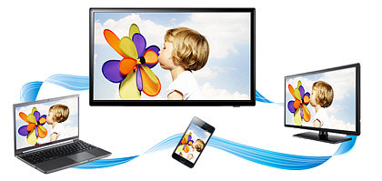 Zintegruj wszystkie urządzenia w jedną całość. Samsung Link bezprzewodowo łączy się z kompatybilnymi urządzeniami za pomocą technologii DLNA, dzięki czemu filmy, zdjęcia i muzyka zapisane na nich mogą być oglądane, odtwarzane i udostępniane na ekranie telewizora. Teraz możesz bez wysiłku przesyłać zasoby z komputera lub urządzenia mobilnego do telewizora.