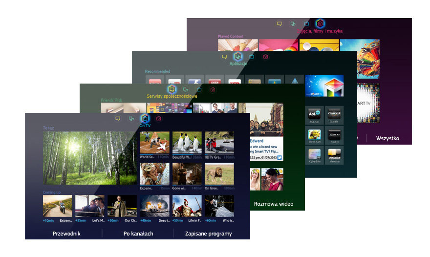 Jeszcze prostsze użycie Bądź duszą towarzystwa w serwisach społecznościowych za pomocą usługi Smart Hub. Strona z serwisami społecznościowymi umożliwia przeglądanie zawartości opublikowanej przez znajomych na Facebooku czy Twitterze, a nawet prowadzenie rozmów wideo przez Skype’a.