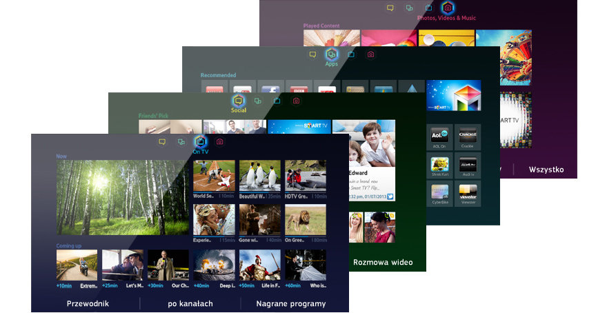 Bądź duszą towarzystwa w serwisach społecznościowych za pomocą usługi Smart Hub. Strona z serwisami społecznościowymi umożliwia przeglądanie zawartości opublikowanej przez znajomych na Facebooku czy Twitterze, a nawet prowadzenie rozmów wideo przez Skype’a.