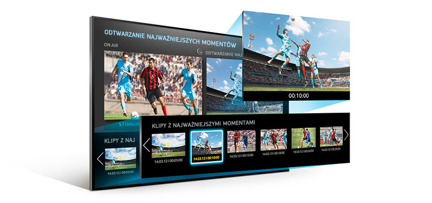 Tryb piłkarski piłka nożna wzmacnia doznania płynące z oglądania transmisji sportowych. Kolory zyskują na intensywności, a mocny efekt dźwięku przestrzennego sprawi, że poczujesz się jak pośród kibiców na największych piłkarskich arenach. Wraz z uruchomieniem trybu telewizor automatycznie rozpoczyna nagrywanie meczu*. Ponadto, każda zmiana intensywności dźwięku, na przykład podczas żywiołowej reakcji publiczności lub zmiany wyniku meczu, spowoduje automatyczne zapisanie najważniejszych momentów, by można było obejrzeć je później. Poddaj się piłkarskiej gorączce – oglądaj mecz na żywo, jednocześnie odtwarzając kluczowe wydarzenia.
