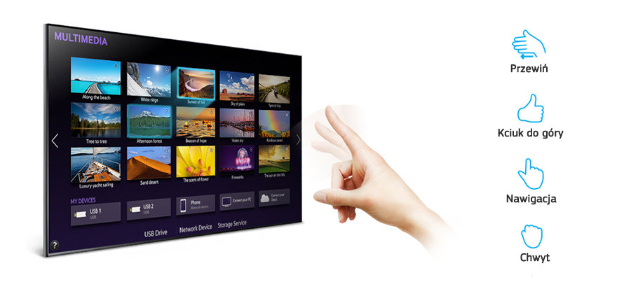 Najnowsza funkcja sterowania gestem pozwala sterować telewizorem nie tylko za pomocą ruchów dłoni, ale również poprzez proste gesty wykonywane palcami. Udoskonalona funkcja sterowania gestem rozpoznaje nawet ruchy palców – teraz wystarczy tylko „kiwnąć palcem”, aby zmienić kanał lub poziom głośności, uruchomić aplikację, przewinąć stronę internetową oraz nawigować po panelu Smart Hub. *Działanie funkcji może być różne, w zależności od oświetlenia otoczenia
