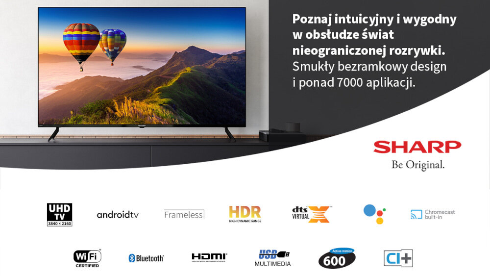 Funkcja HDR10 oraz HLG gwarantuje naturalne nasycenie barw, kontrast oraz jasność, dzięki czemu obraz otrzymuje poszerzony zakres tonalny i oddaje piękno rzeczywistego świata. Jednocześnie realny i bajeczny efekt to zasługa zaawansowanego sterowania jasnością. Ponadto zastosowanie technologii Sharp Active Motion 600 umożliwia doskonałe odtwarzanie dynamicznych akcji w filmach, serialach oraz grach.
