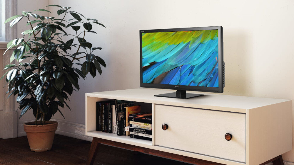 Zakupując telewizor SHARP 24EE3E, otrzymujesz urządzenie podstawowe, podstawę oraz pilota.