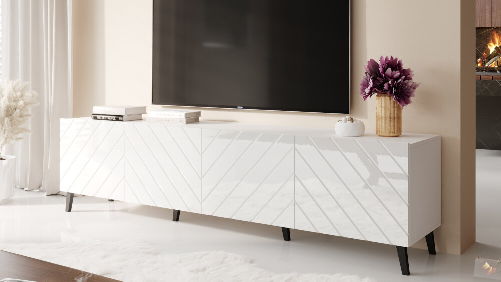 Cztery klapy otwierane do boków zapewniają dostęp do czterech pojemnych schowków, idealnych na przechowywanie sprzętu RTV, gier planszowych, książek i innych przedmiotów. Szeroki blat zapewnia wystarczająco dużo miejsca na telewizor. Możliwość dokupienia nóżek w kolorze złotym lub stelaża pozwala na dopasowanie szafki do indywidualnych preferencji i aranżacji wnętrza.