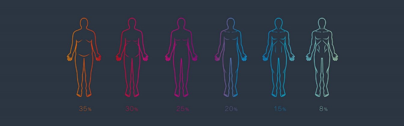 | Zawartość tkanki tłuszczowej a sylwetka Poniższe rysunki pokazują, w jakim stopniu (przy takiej samej masie ciała) zawartość tkanki tłuszczowej wpływa na naszą sylwetkę. |