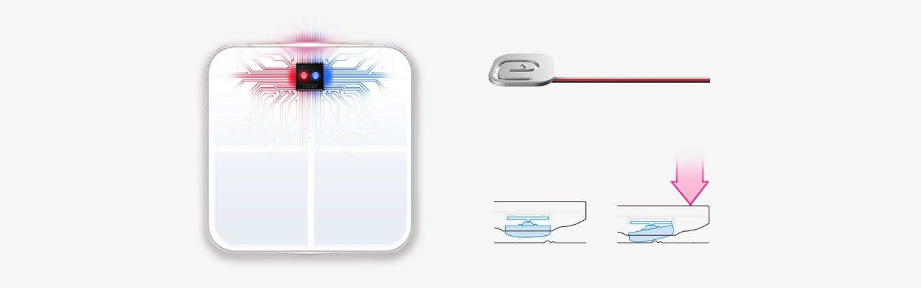 | Jak to działa? Technologia bioelektrycznej impedancji (BIA); Warstwa ITO bez części metalowej dla zwiększenia czułości. |