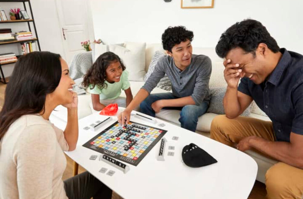 Scrabble® Pułapki Planszowa gra słowna z pułapkami, płytkami aktywującymi, stojakami i woreczkami na płytki, prezent dla nastolatków i dorosłych, na rodzinny i przyjacielski wieczór gier, dla graczy od 10 roku życia.