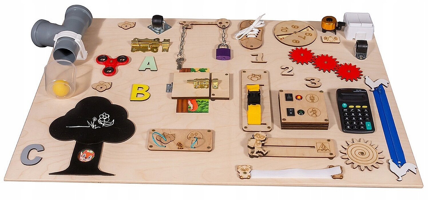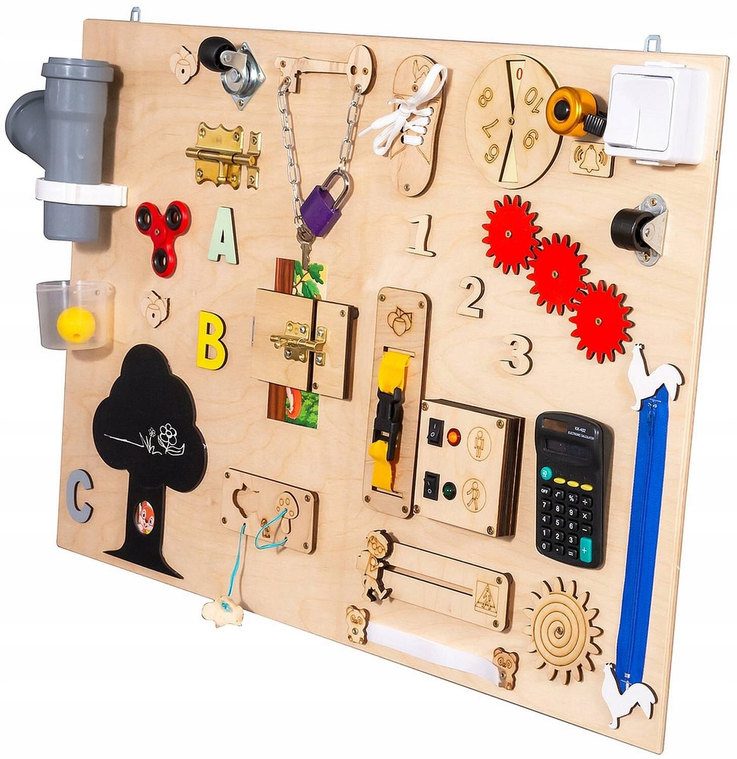 Tablica sensoryczna to świetny pomysł na kreatywną zabawę dla Twojej Pociechy. Nauka przez zabawę to najlepszy sposób na prawidłowy rozwój dzieci. Tablica jest idealnym miejscem na ćwiczenie pierwszych literek, cyferek oraz zasad panujących na przejściach dla pieszych. Odpowiednio wyselekcjonowane elementy ruchome i grające sprawią, że Twoje dziecko rozwinie swoją kreatywność oraz zdolności manualne. Dodatkowo pobudzi to w nim pomysłowość i zachęci do eksplorowania otaczającego go świata.Tablica wykonana w Polsce, bardzo solidna, z materiałów o wysokiej jakości.