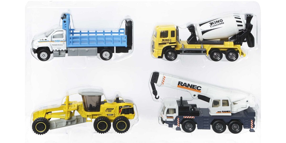 W zestawie znajdują się następujące pojazdy z serii Matchbox Working Rigs™: GMC 3500 Attenuator Truck, MBX Mobile Crane™, Road Grader i Cement King™.