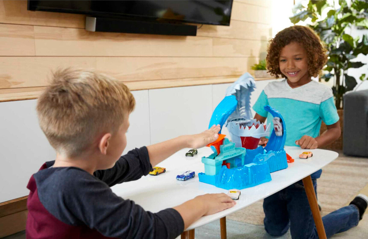 Ogromny mechaniczny rekin zaatakował miasto Hot Wheels. Dzieci mogą przetestować swoje umiejętności – czy ich pojazd będzie na tyle szybki, by przejechać przez falę i uniknąć pożarcia? Wypełnij pojemnik w brzuchu ogromnego Roborekina ciepłą wodą – jeśli pojazd do niego wpadnie, „magicznie” zmieni kolor. Najpierw trzeba zanurzyć pojazd w zbiorniku z zimną wodą, a potem przesunąć dźwignię, by załadować go na wyrzutnię i przygotować się do skoku przez fale.