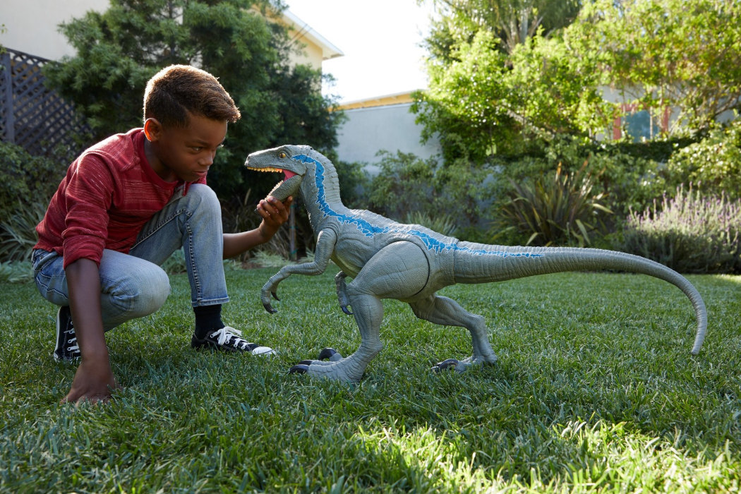 Kolosalny Velociraptor Blue ma bardzo szerokie szczęki, które mogą się otwierać i zamykać, dzięki czemu może połknąć w całości nawet 20 minifigurek (sprzedawanych oddzielnie). Wystarczy otworzyć drzwiczki na brzuchu, aby uwolnić minifigurki i odgrywać interaktywne bitwy!