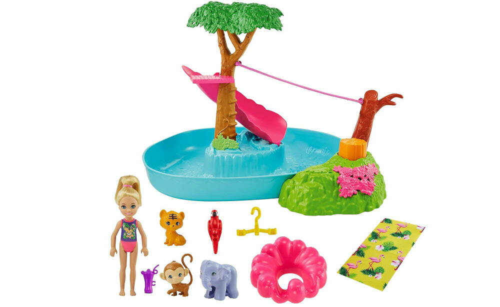 Poznaj Chelsea - mniejszą wersję znanej lalki Barbie. Młoda dama wyrusza dziś na letnią przygodę wraz ze swoimi przyjaciółmi - zwierzętami: papugą, słoniem, małpką i tygryskiem. Przyjaciele spędzą fantastyczny czas na basenie i będą się super bawić. Dołączysz?