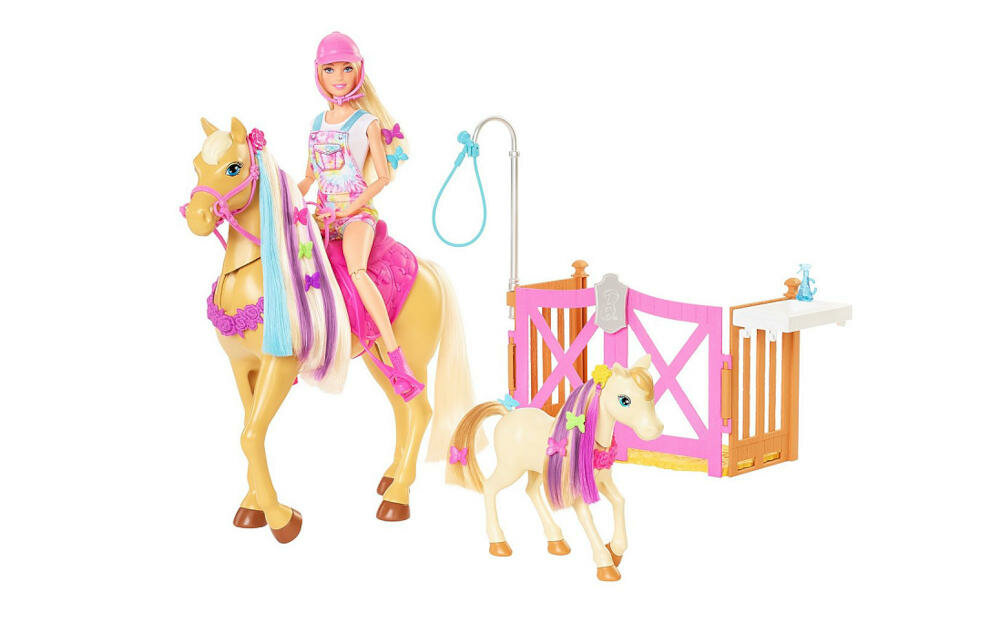 Poznaj fantastyczną zabawkę, jaką jest lalka Barbie - blondynka ze swoimi konikami - dużym i małym źrebakiem - od marki MATTEL. Jest to fantastyczne trio przyjaciół, które uwielbia spędzać razem czas. Możesz zgiąć lalkę Barbie w kolanach i posadzić ją w siodle większego konia, aby wybrać się na przejażdżkę. Już dziś zainspiruj zabawę w pielęgnowanie, stylizację i wspaniałą przyjaźń! Produkt nieprzeznaczony dla dzieci poniżej 3 roku życia.
