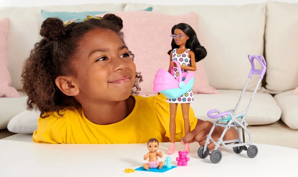 Zestaw Barbie® Skipper™ Klub opiekunek pozwalają dzieciom odkrywać swoją odpowiedzialną stronę jako opiekunka do dziecka. Dzięki temu zestawowi dzieci mogą pomóc lalce opiekunki opiekować się lalką w uroczym wózku, który buja się w górę i w dół podczas pchania! Opiekunka ma na sobie sukienkę ze stylowym, kolorowym nadrukiem, a różowe buty dopełniają jej stylizację.