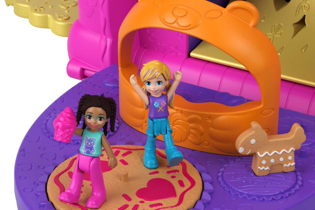 Zawartość: zestaw Polly Pocket™ Miś Automacik Superniespodzianki z 4 obszarami zabawy i 32 akcesoriami (w tym mikrolalkami Polly™ i Shani™oraz 6 „gumami”).