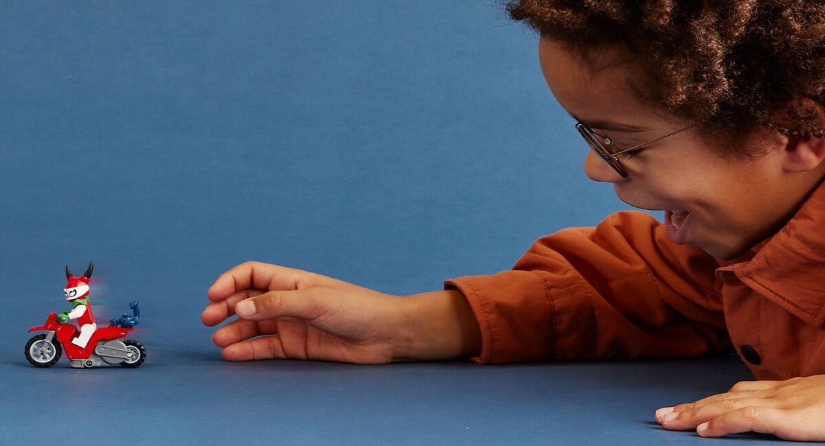 Zestaw z motocyklem kaskaderskim zawiera łatwe instrukcje z obrazkami, dzięki którym dzieci mogą samodzielnie złożyć własną zabawkę LEGO albo zaprosić do zabawy w budowanie przyjaciół i członków rodziny.