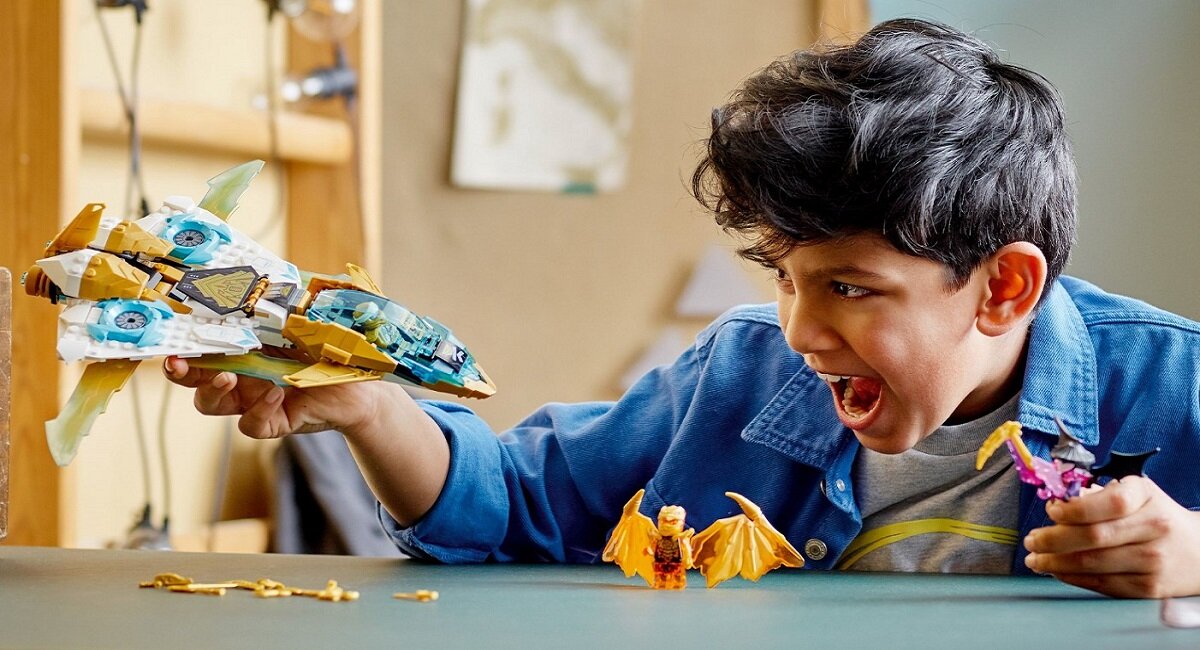 Zestaw LEGO Ninjago Złoty smoczy odrzutowiec Zane’a 71770 nie zawiera żadnych elementów elektronicznych, więc nie działa na baterie. Zabawa toczy się zatem pod dyktando dziecięcej wyobraźni i może trwać i trwać. Dziecko nie tylko ma frajdę, ale też podczas zabawy uczy się zażegnywać problemy, zręcznie poruszać się figurkami i budować obiekty.