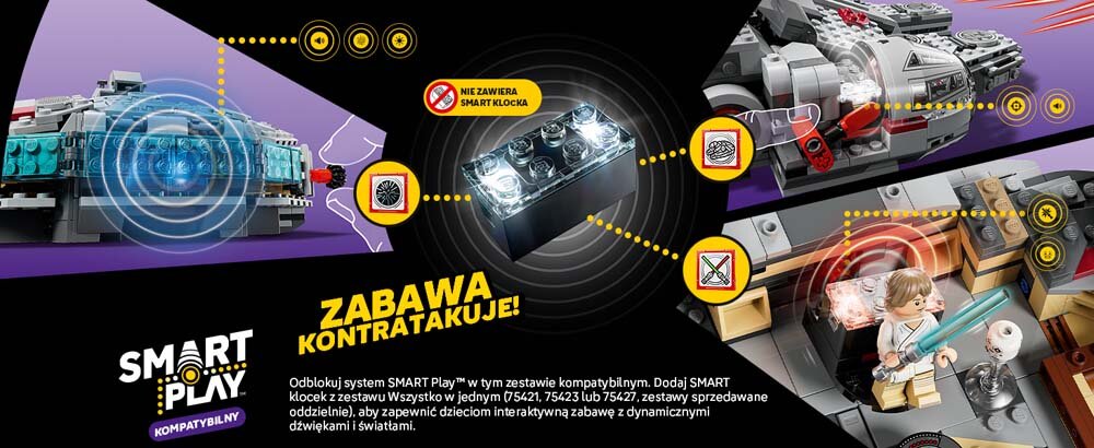 Wciel się w role z czterema SMART minifigurkami LEGO® na pokładzie Sokoła Millennium, skocz w nadprzestrzeń i zmierz się z Darthem Vaderem w jego myśliwcu TIE.