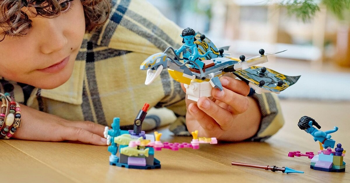 Ten zestaw LEGO Avatar zawiera zabawkowy warkocz Na’vi, podwodną włócznię i dwie egzotyczne ryby.