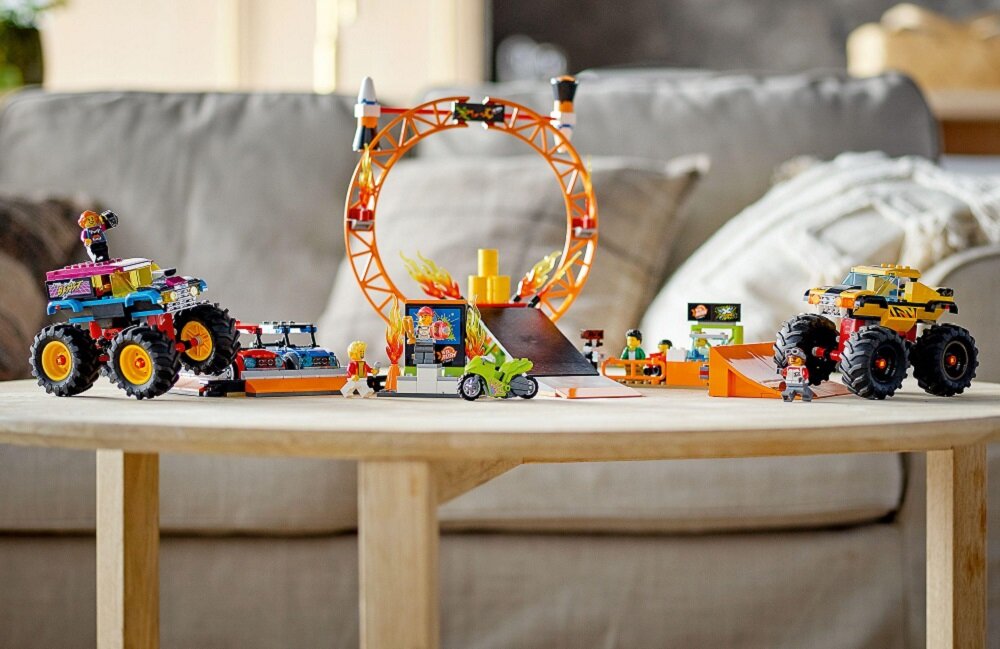Co jest w środku? Wszystkie elementy dwóch monster trucków, dwóch aut z dachami do niszczenia, płonącej obręczy, ramp do skakania, motocykla kaskaderskiego napędzanego kołem zamachowym, stoiska z hot dogami i podium oraz siedem minifigurek, łącznie to aż 668 elementów.