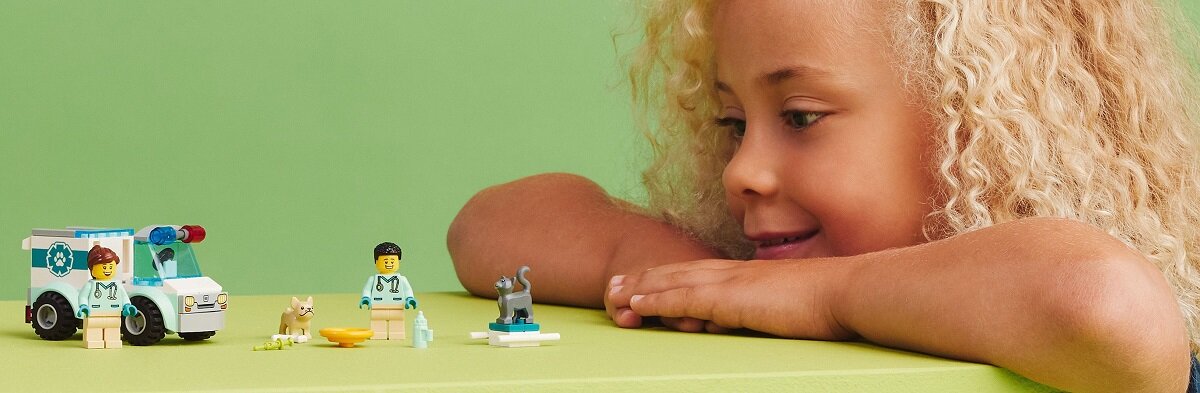 Wszystko, czego potrzebują dzieci do stworzenia karetki weterynaryjnej oraz dwie minifigurki weterynarzy, figurki kota i psa, a także akcesoria.