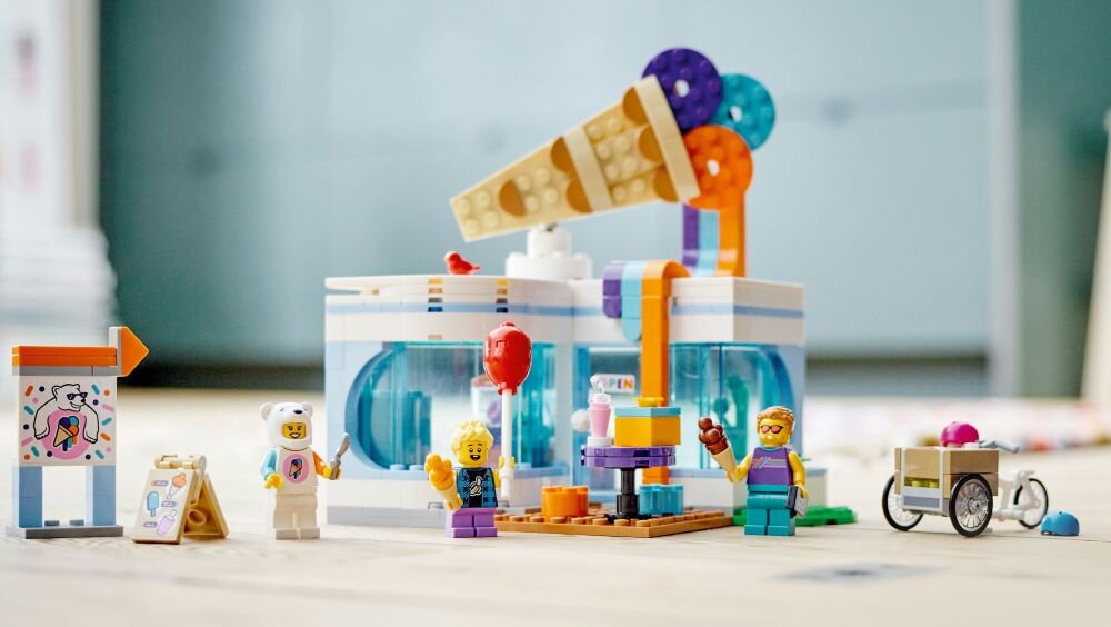 Zestaw zawiera mnóstwo elementów do pomysłowej zabawy, w tym ladę z lodami, blender, lodówkę i część wypoczynkową na świeżym powietrzu. To idealne miejsce na pomysłową zabawę trzema minifigurkami, które są w zestawie.