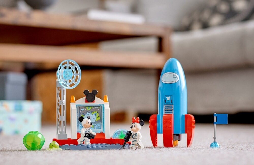 Zestaw z rakietą i stacją kosmiczną do nauki budowania zawiera dwie minifigurki, wyjątkową płytkę z sylwetką Mikiego oraz klocki startowe, które ułatwiają składanie modeli — dzięki temu dzieci mają więcej czasu na zabawę!