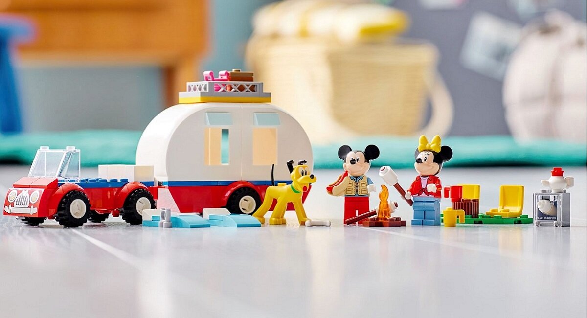 Zestaw konstrukcyjny obejmuje samochód, przyczepę kempingową, minifigurki Myszki Miki i Myszki Minnie, figurkę LEGO Pluto, biwak oraz inne akcesoria inspirujące do zabawy w podróże.