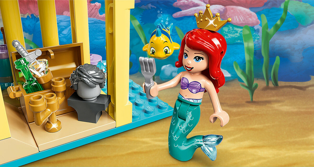 Z klocków dzieci zbudują imponujący pałac króla Trytona, w którym mieszka on i jego córki. Podczas zwiedzania pałacu można odgrywać scenki z filmu lub tworzyć własne niepowtarzalne historie. Dzięki złotej zjeżdżalni postacie szybko znajdą się przed pałacem, gdzie już czeka powóz zaprzężony w delfiny, którym wystarczy jedno słowo, by zabrać syrenki w podróż po dnie morza. Podczas zabawy dzieci mogą wcielić się w Arielkę, Aristę albo króla Trytona, którzy znaleźli się w zestawie.