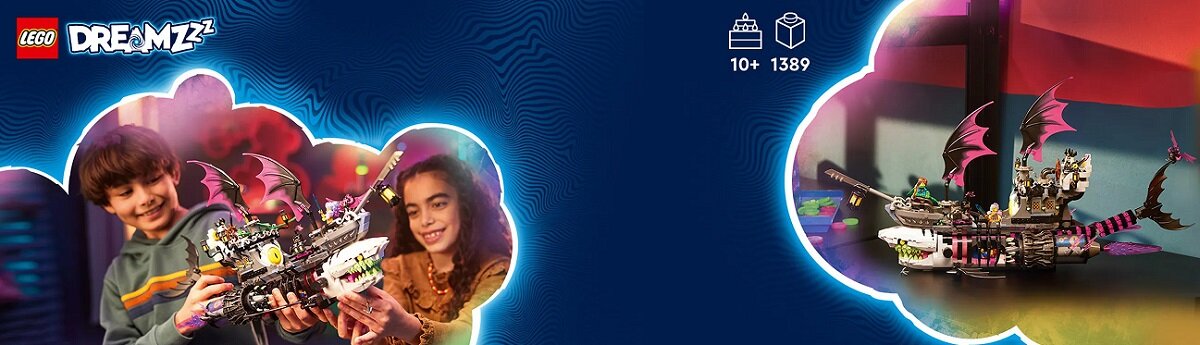 Dzięki zestawowi LEGO® DREAMZzz™ Koszmarny rekinokręt (71469) dzieci wkroczą do krainy snów. Nocny Łowca schwytał ulubionego pluszaka Izzie i połączył go ze statkiem pirackim, tworząc potworny pojazd, który dzieci mogą teraz zbudować. Zestaw składa się z 1389 elementów i jest przeznaczony dla dzieci powyżej 10 roku życia.
