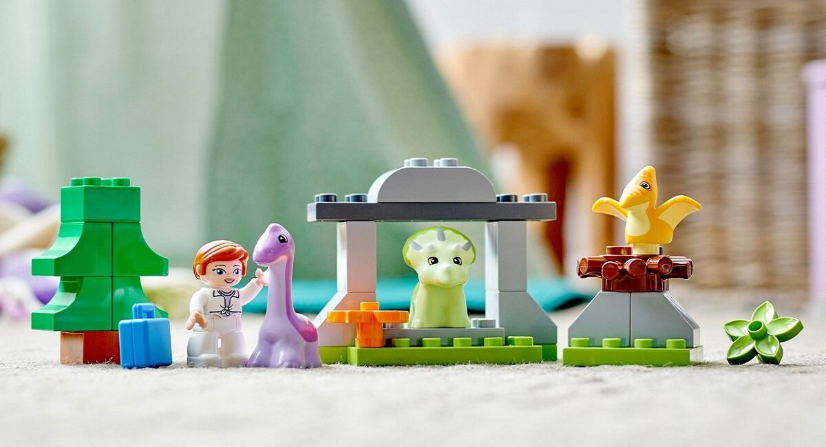 Zestaw LEGO Duplo Jurassic World Dinozaurowa szkółka 10938 inspiruje do długich godzin zabawy w opiekę nad trzema młodymi dinozaurami mieszkającymi w lesie. W komplecie jest fragment lasu do zbudowania, figurki triceratopsa, pteranodona oraz brachiozaura, a także założycielka Grupy Ochrony Dinozaurów — Claire Dearing.