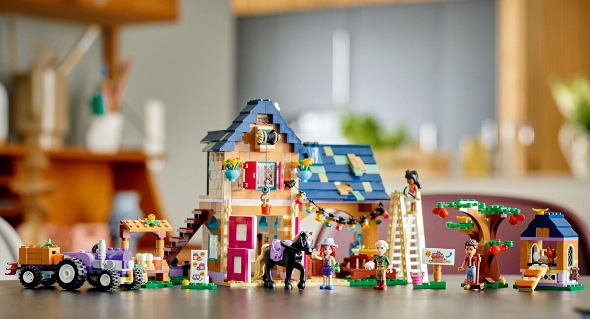 Zestaw z farmą zawiera konia, którego można pielęgnować, figurkę kurczaka, tradycyjną farmę, traktor z przyczepką, kurnik i cztery minilaleczki LEGO Friends.